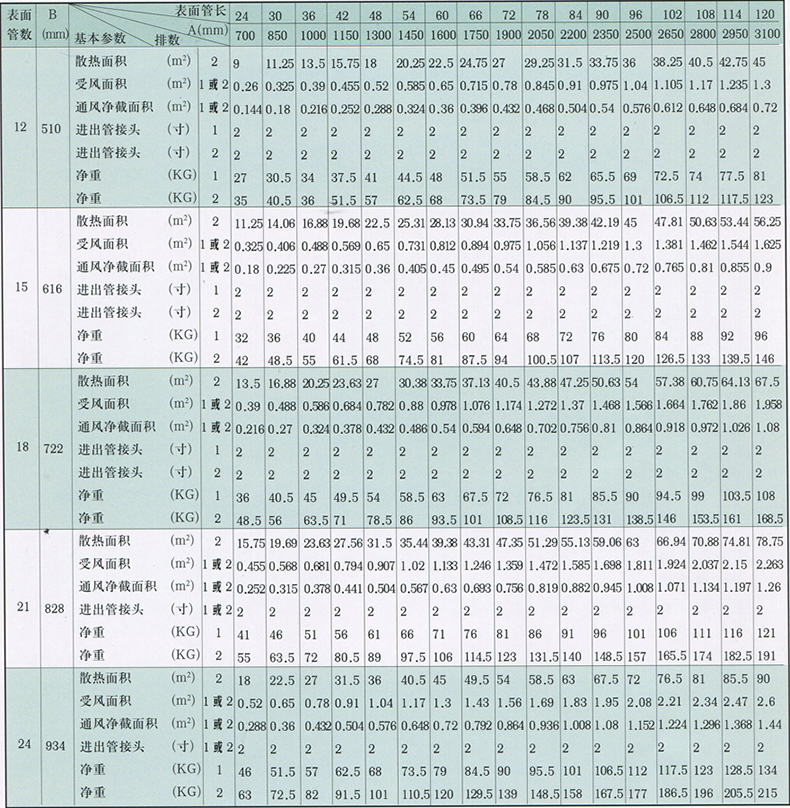 如采用兩排,片距為3.2mm,表麵管數為21,管長為60英寸,則為UⅡ——2(R)——21——60。